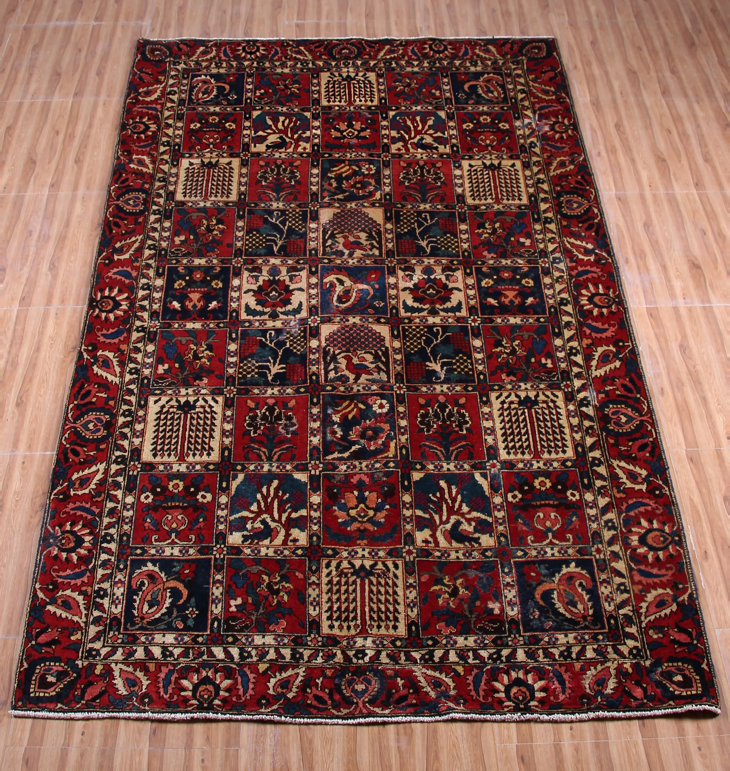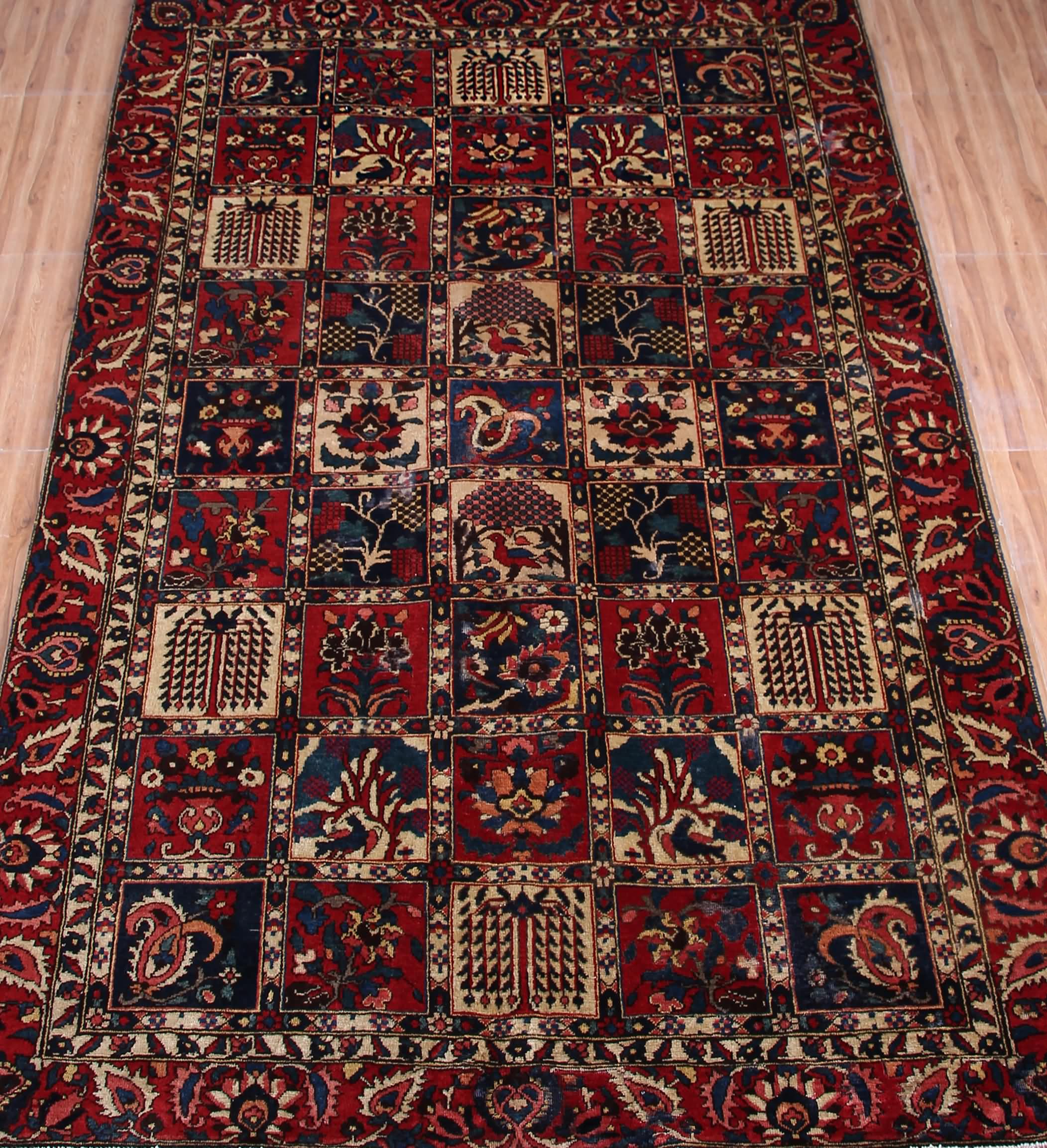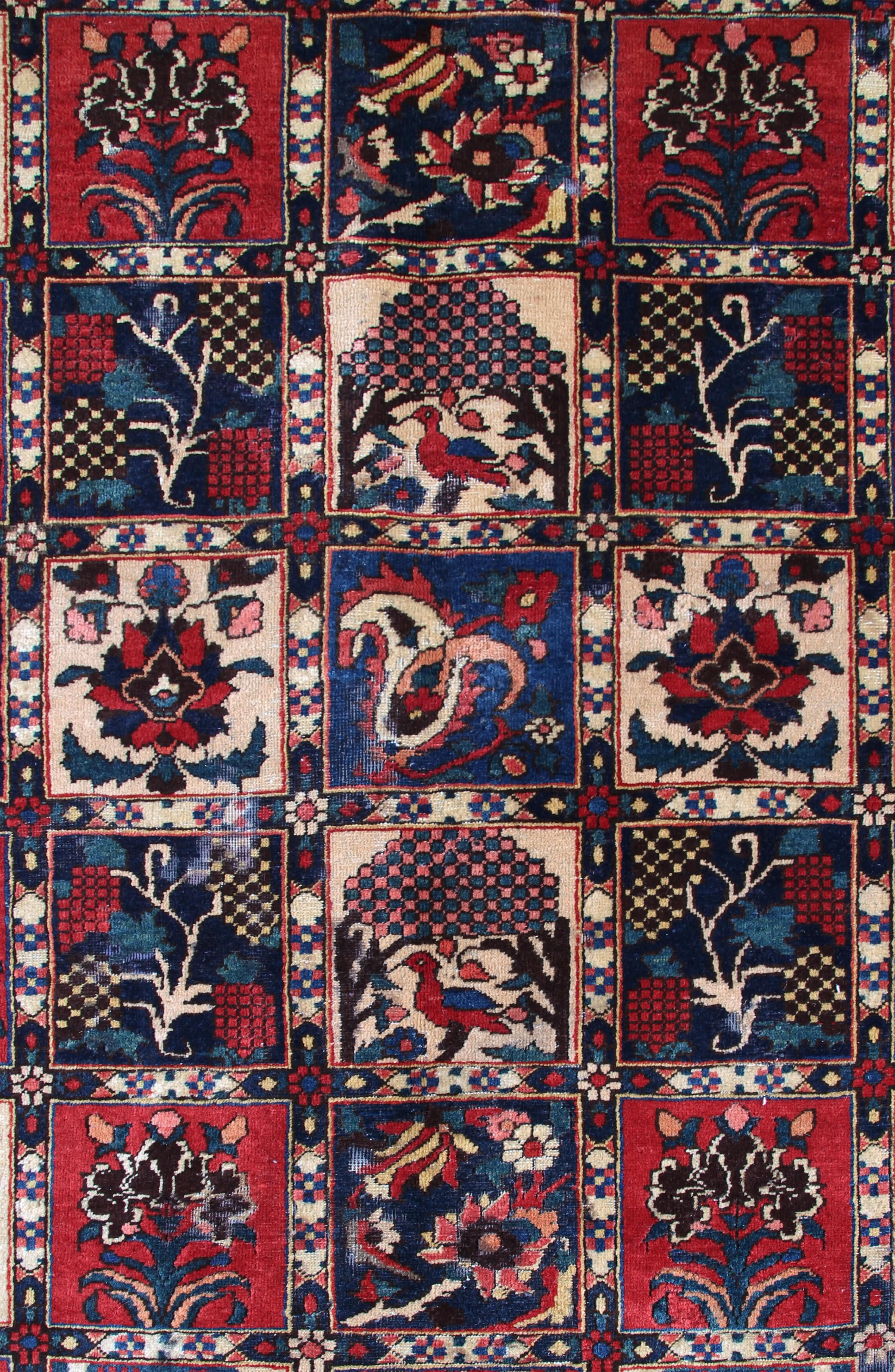 About Persian Bakhtiari Rug: This beautiful rug was hand-knotted by nomads of the Bakhtiari tribe. Bakhtiari carpets are made of strong and sturdy wool. They are knotted from thick wool, which reduces their deterioration. In many places Bakhtiar carpets are made with motifs inspired by gardens. The Chesti pattern features design with plants and animals from nature. They are inspired by typical Persian gardens.