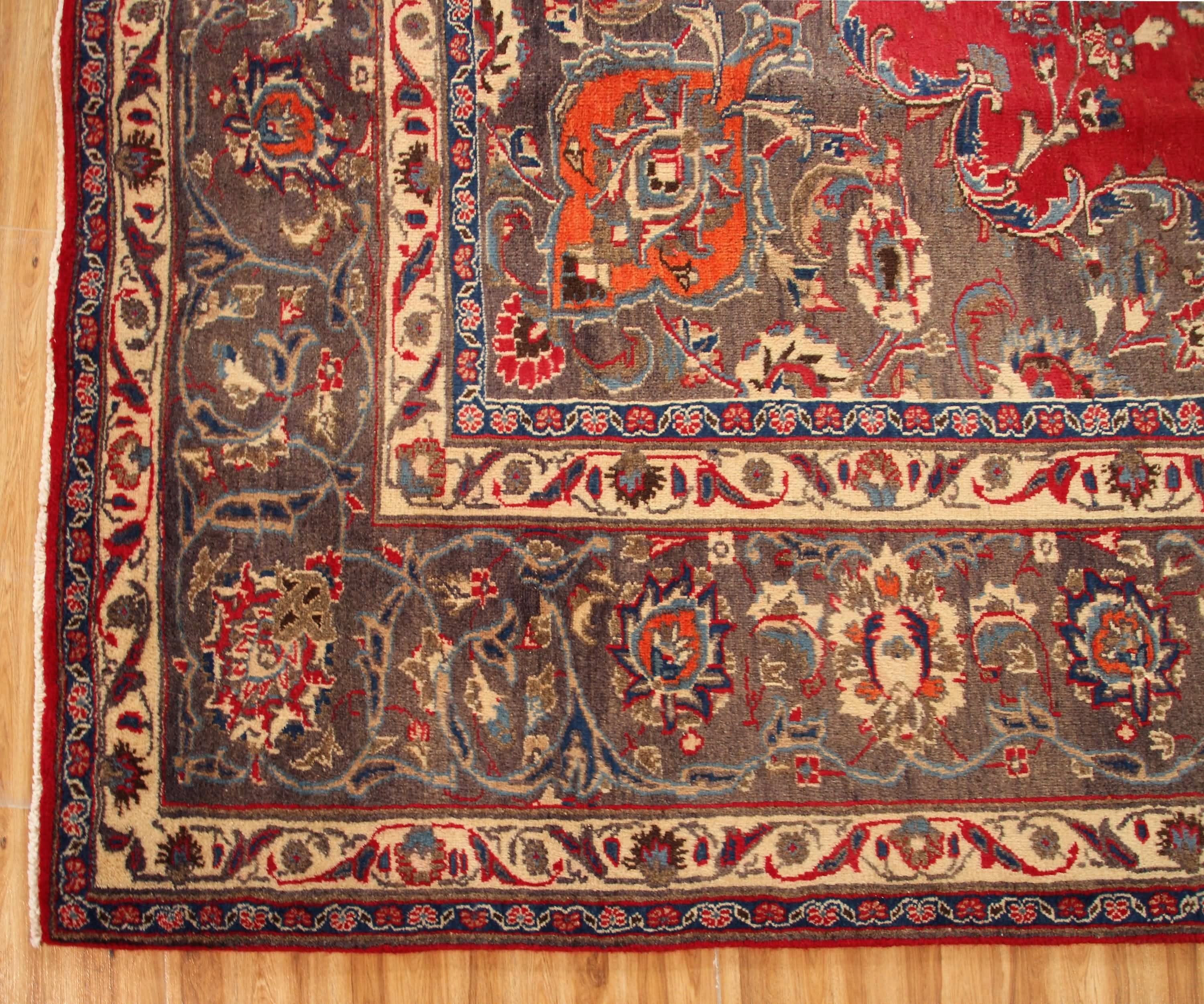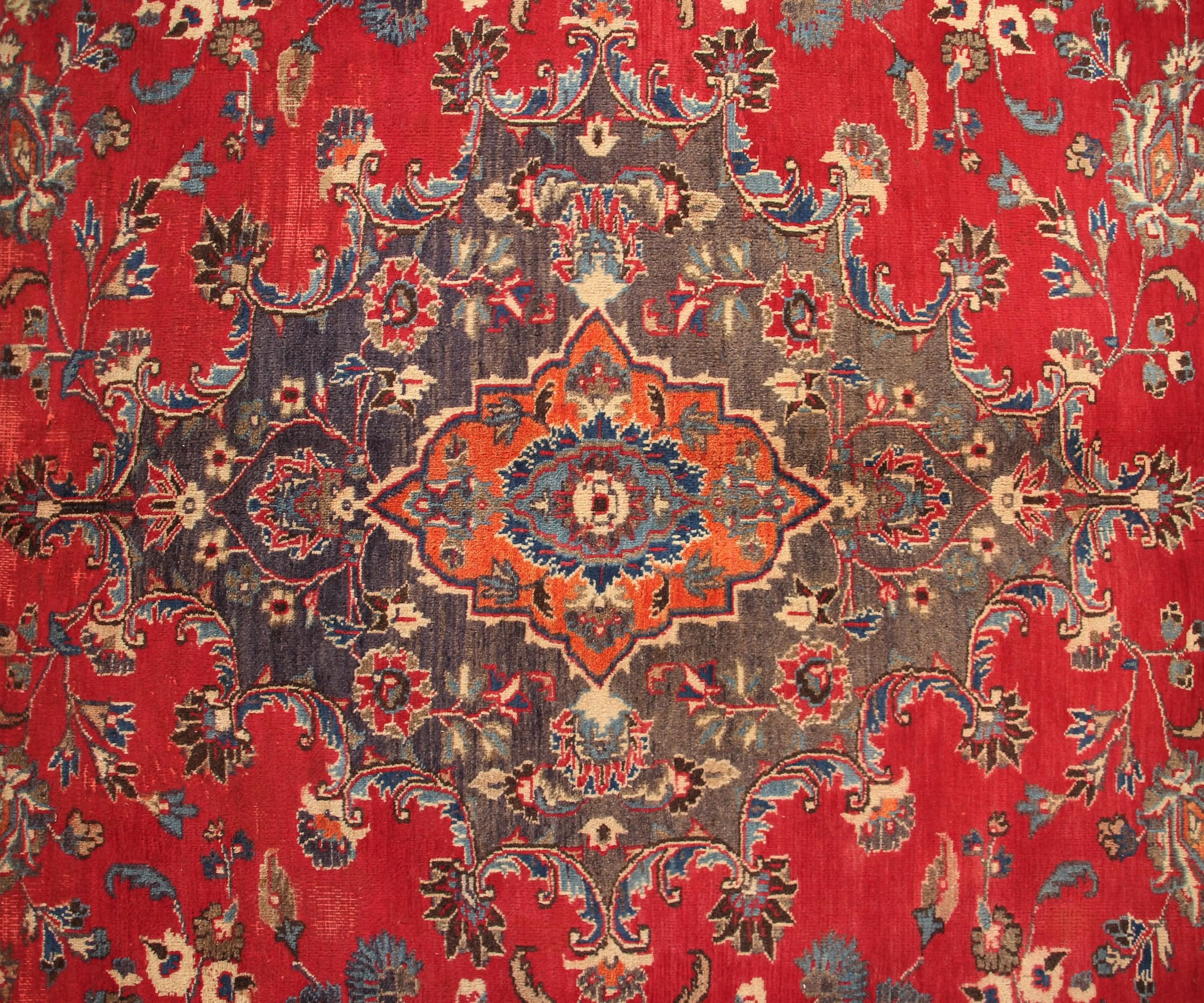 About Persian Mashad Rug: This beautiful rug was hand-woven in Mashad, Iran. Mashad carpets are authentic Oriental carpets which are easy to recognize with their famous medallions surrounded by floral motifs. They are often dominated by red tones, with blue tones in the border. High-quality wool is used, giving a hardwearing carpet. Typical knot density of Mashad rug can be 160,000 – 260,000 knots sqm.