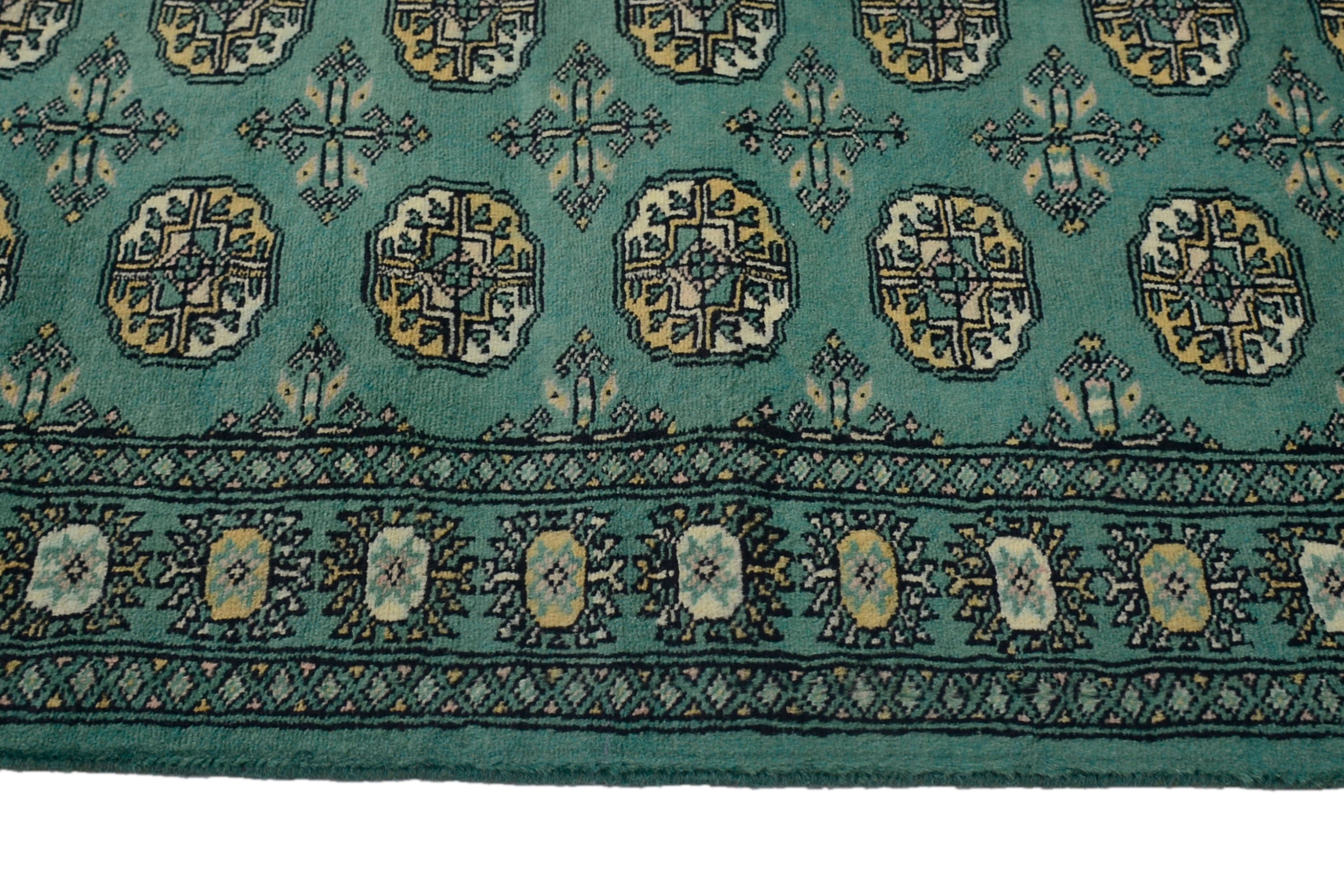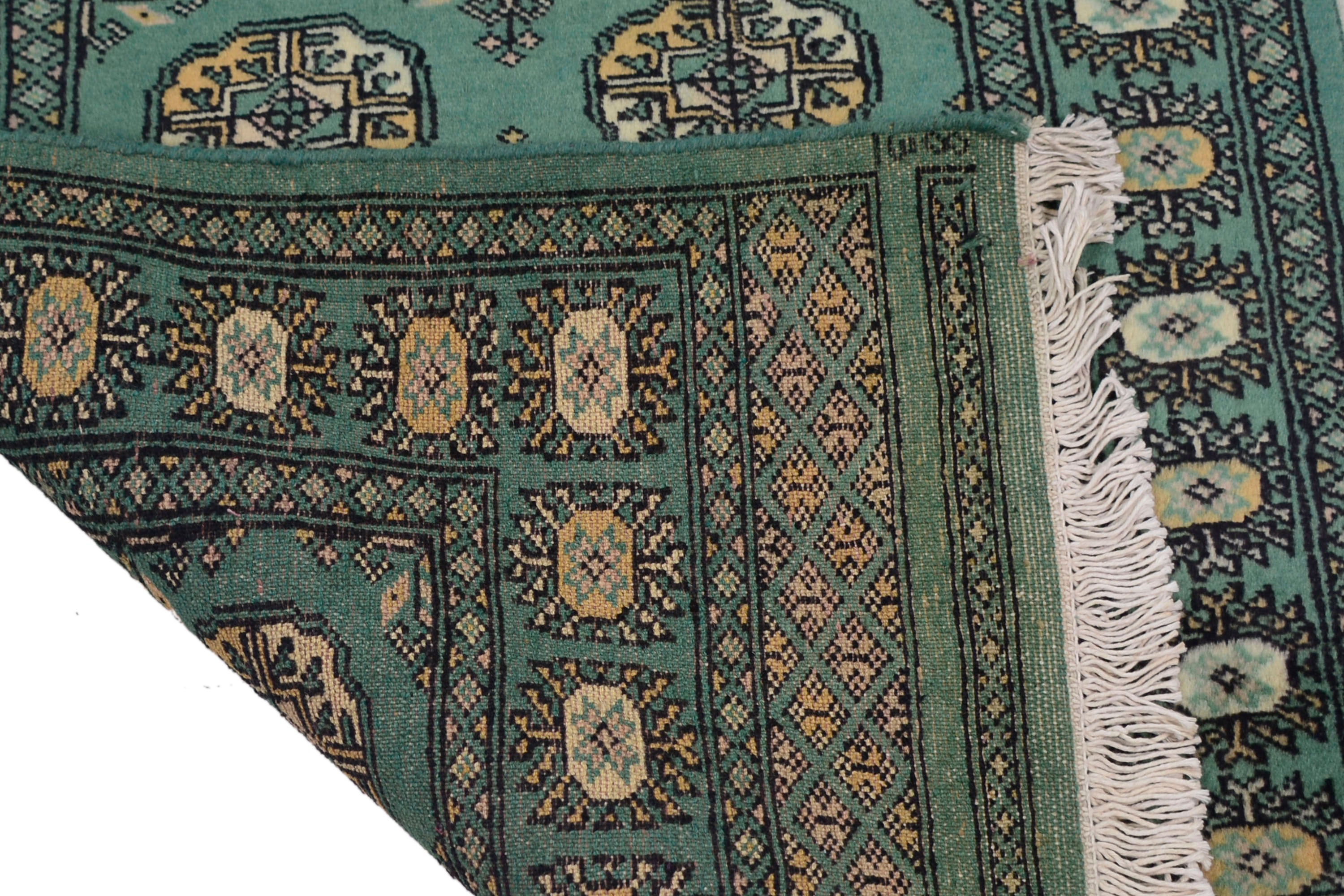 About Bukhara Rug: This beautiful rug has been hand-knotted in the Kashmir/Peshawar region by skilled artisan weavers. Bokhara rugs are some of the finest rugs manufactured in Pakistan. Using a combination of NZ and local Pakistani wool on a cotton base, the Pakistani Bokhara has an incredibly soft and thick pile with an average high knot count (approx. 150~200 KPSI). These stunning Bokhara rugs have small, repeating geometric designs.