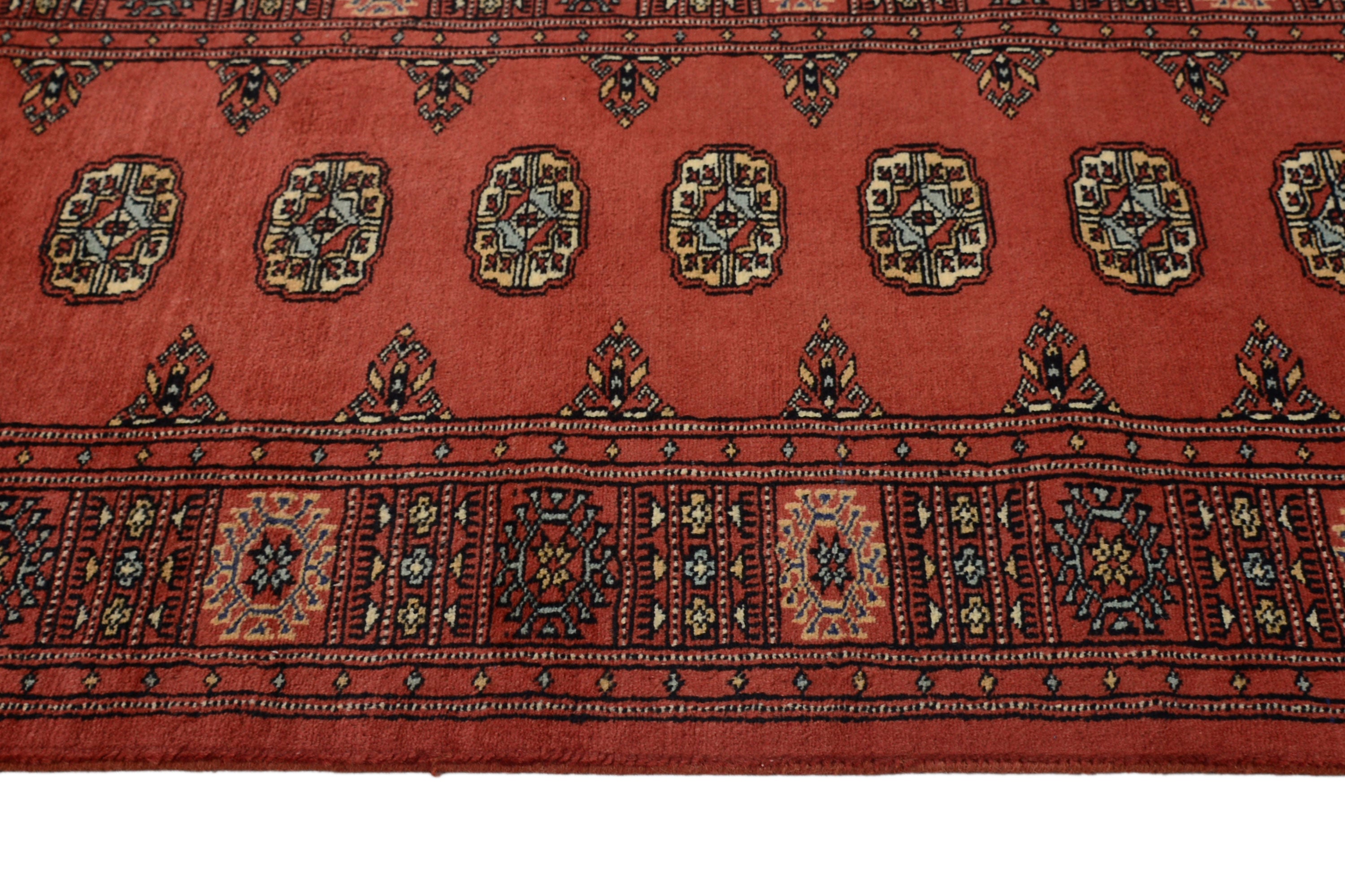 About Bukhara Rug: This beautiful rug has been hand-knotted in the Kashmir/Peshawar region by skilled artisan weavers. Bokhara rugs are some of the finest rugs manufactured in Pakistan. Using a combination of NZ and local Pakistani wool on a cotton base, the Pakistani Bokhara has an incredibly soft and thick pile with an average high knot count (approx. 150~200 KPSI). These stunning Bokhara rugs have small, repeating geometric designs.